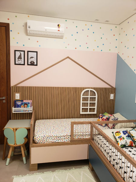 Mantivemos tudo aquilo que era importante para eles, e preservamos a individualidade de cada um. Júlia ama rosa, e o Gabriel adora azul! Prontinho, temos um quarto azul e rosa super charmoso e super funcional. Para completar essa combinação de cores do quarto, optamos pelos adesivos de bolinhas da mooui que trouxe muito charme e delicadeza!